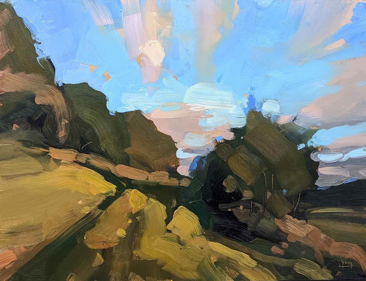 Hester Berry: My practice is rooted in traditional representation and methods. However I constantly challenge my understanding of “painting” and explore ways paint can represent effects such as light, time, movement and climate. However I use the marks available to me as economically as possible, distilling the image, feeling and moment into what is necessary, so that through objective representation there is enough room for subjective interpretation.