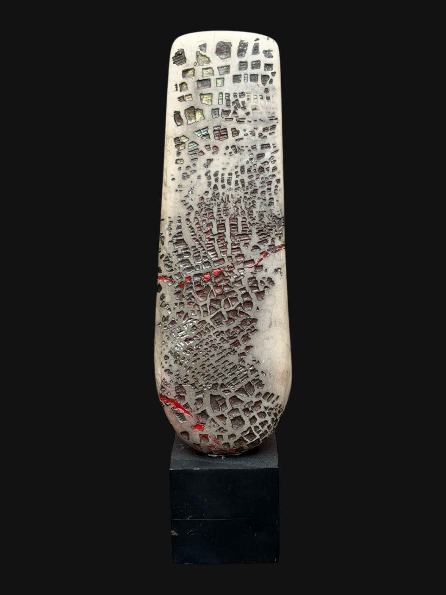 The distinctive appearance of Peter Hayes‘ ceramic sculpture comes from a technique called Raku firing. Raku generally refers to a type of low-firing process. Western-style raku usually involves removing pottery from the kiln while at bright red heat. Then placing it into containers with combustible materials. This produces an intense reduction atmosphere which affects the colours in glazes and clay bodies.