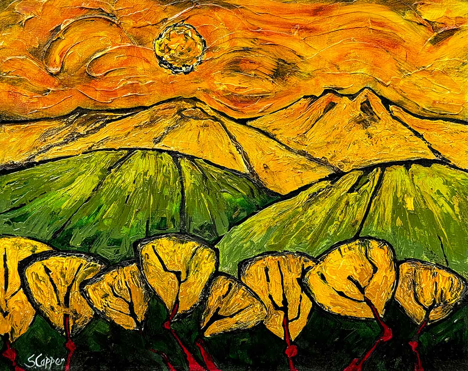 Steve Capper’s paintings of hills and valleys are produced by simple individual shapes. Which combine to form more complex images. The shapes and patterns provide an ideal vehicle for Steve’s art work with colour. Furthermore his use of primary colour both enhances and emphasises the fascinating aspects of this landscape environment.